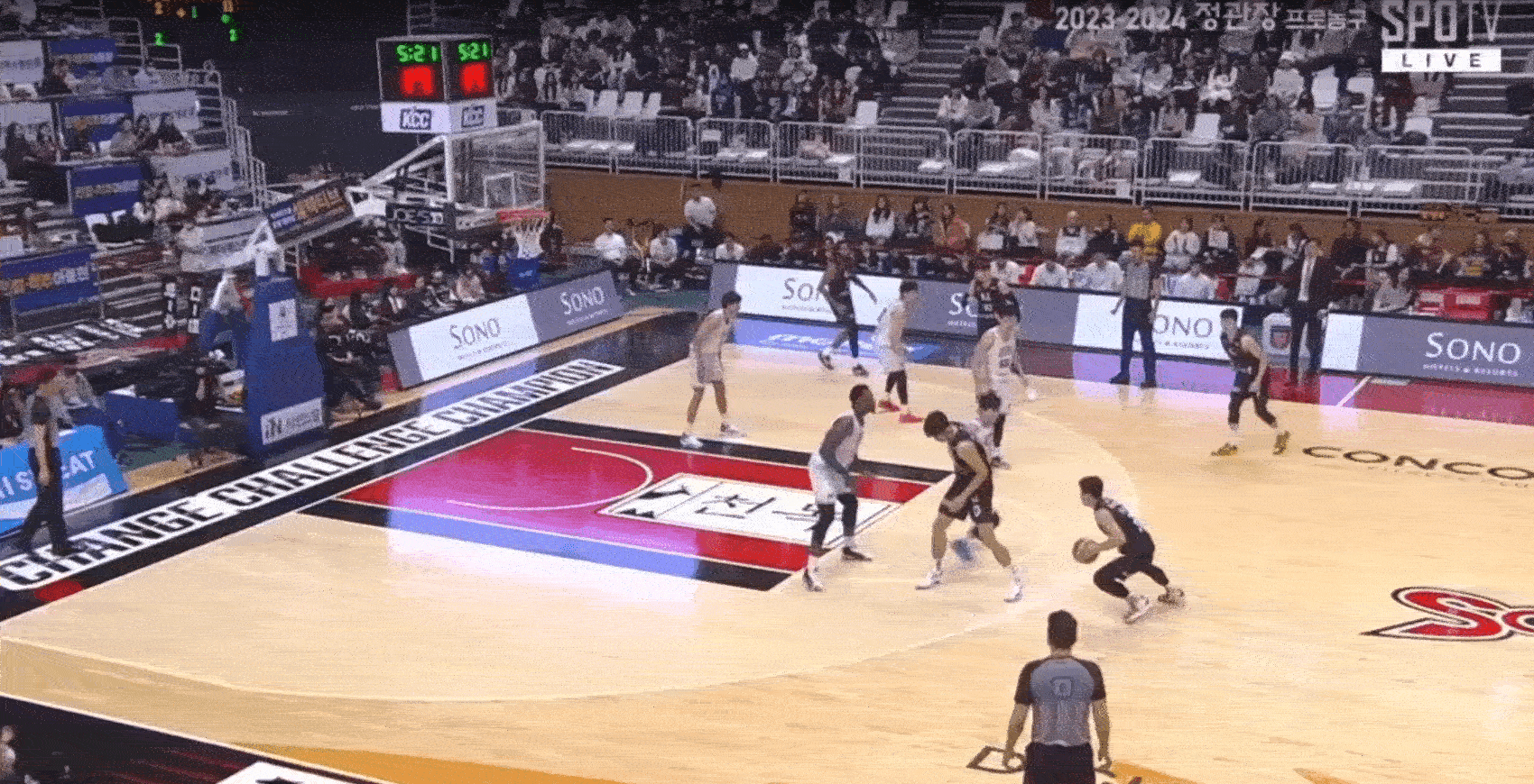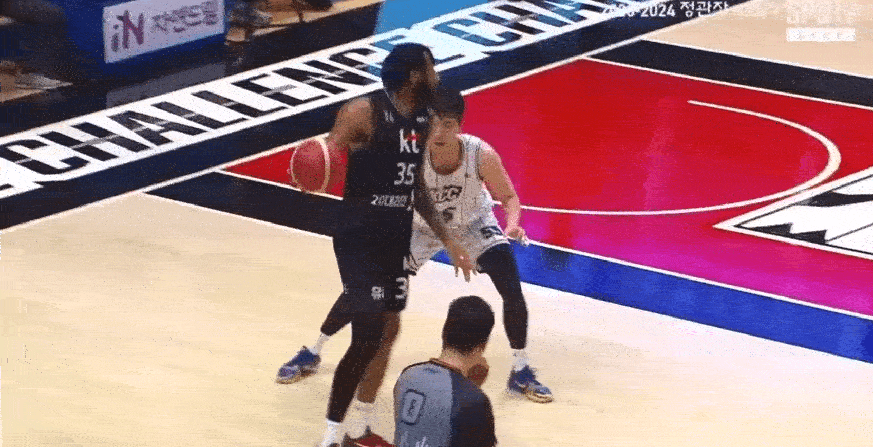 발이 느린 라건아를 따돌리고 돌파를 성공 시키는 정성우