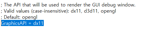 GraphicsAPI = oepngl로 되어 있는 걸 찾아서. opengl을 dx11로 바꿔 주세요.