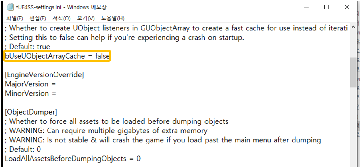- 메모장의 수많은 글자 중 bUseUObjectArrayCasche = true로 되어 있는 걸 위의 그림처럼 false로 바꿔 주세요.