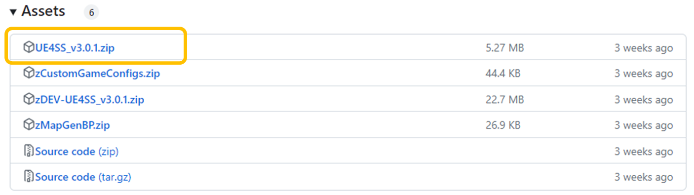 - 아래의 링크로 접속해서 'UE4SS_V3.0.1.ZIP' 파일을 다운로드 받으세요. (최신 버전을 받으시면 됩니다.)