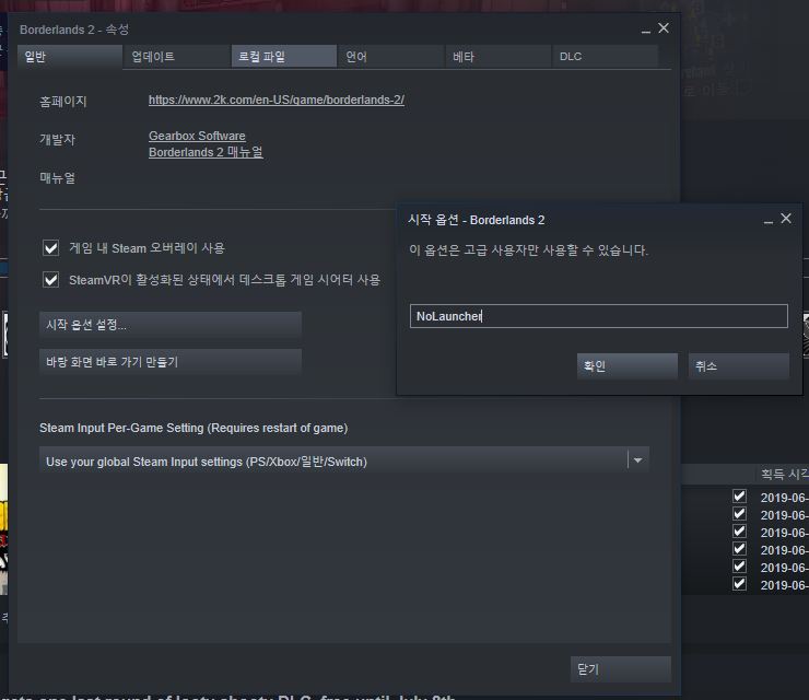 스팀 옵션에서 보더랜드 2의 시작 옵션을 바꿔주는 방법입니다.