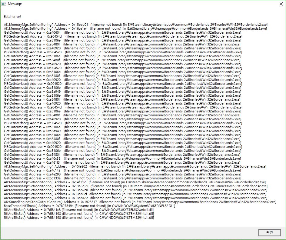 보더랜드 2를 재밌게 즐기던 중 갑자기 Fatal error를 만났습니다.