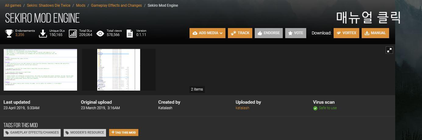 * 모드 설명 페이지에서 'Manual'을 클릭해 세키로 모드 엔진 다운로드합니다.