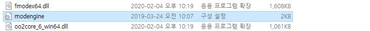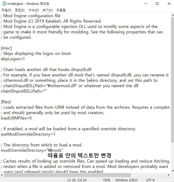 * 혹시 변경이 어려우시다면 아래의 'modengine.ini'파일을 다운로드하여 덮어쓰기 하세요. (제가 바꿔 놓은 거예요.)