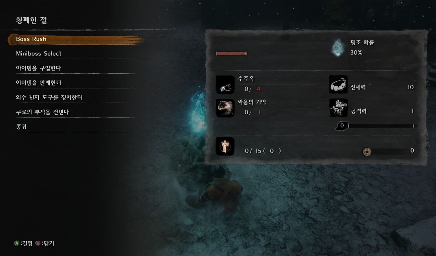 세키로 보스 러시 모드는 게임을 처음 시작할 때의 아무것도 없는 약한 상태에서 시작합니다.
