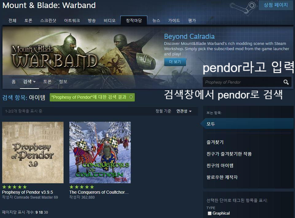 * 스팀 라이브러리의 마블 워밴드 창작마당에 가서 펜도르를 검색합니다.