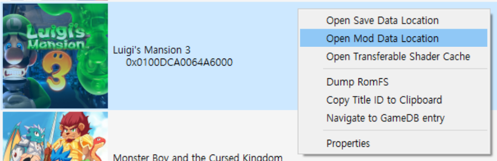 * 루이지 맨션 3 > 우클릭 > 'Open Mod Data Location' 을 선택해 모드 폴더로 진입합니다.