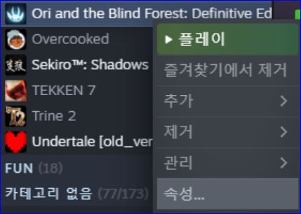 * 라이브러리>오리와눈먼숲DE(우클릭)>속성>로컬파일 탭>'로컬 콘텐츠 폴더 보기'를 클릭해 설치 폴더로 이동~