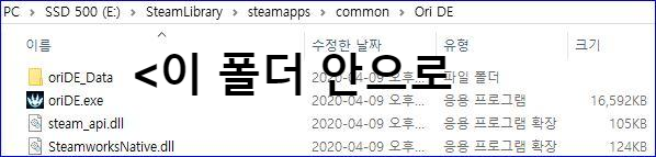 * 복사 후 앞 서 확인한 오리와 눈먼숲 설치 폴더인 'oriDE_data'폴더 안에 덮어쓰기합니다.