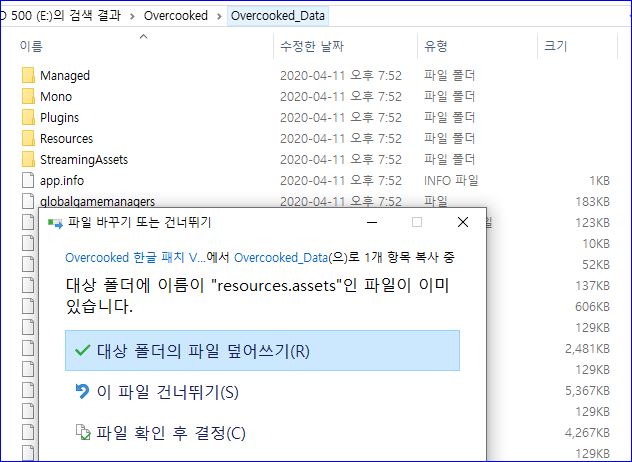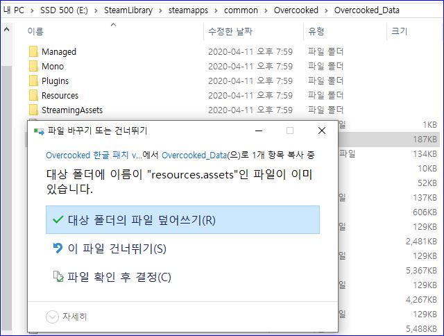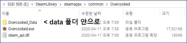3. 아까 확인했던 설치 폴더인 'Overcooked_Data' 폴더 안에 복사한 파일을 덮어쓰기합니다.