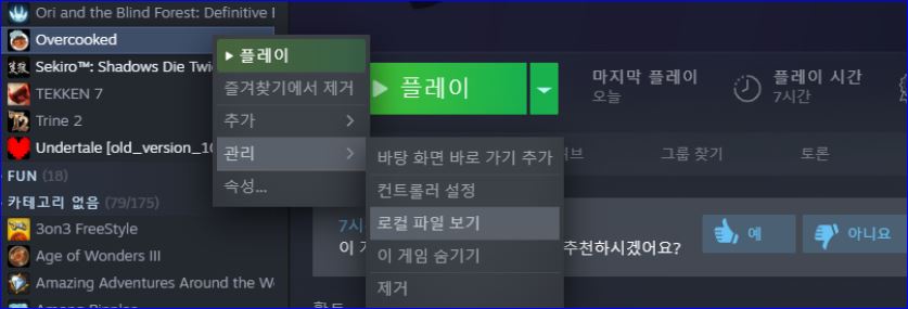 * 스팀 라이브러리>Overcooked(우클릭)>관리>'로컬 파일 보기' 클릭