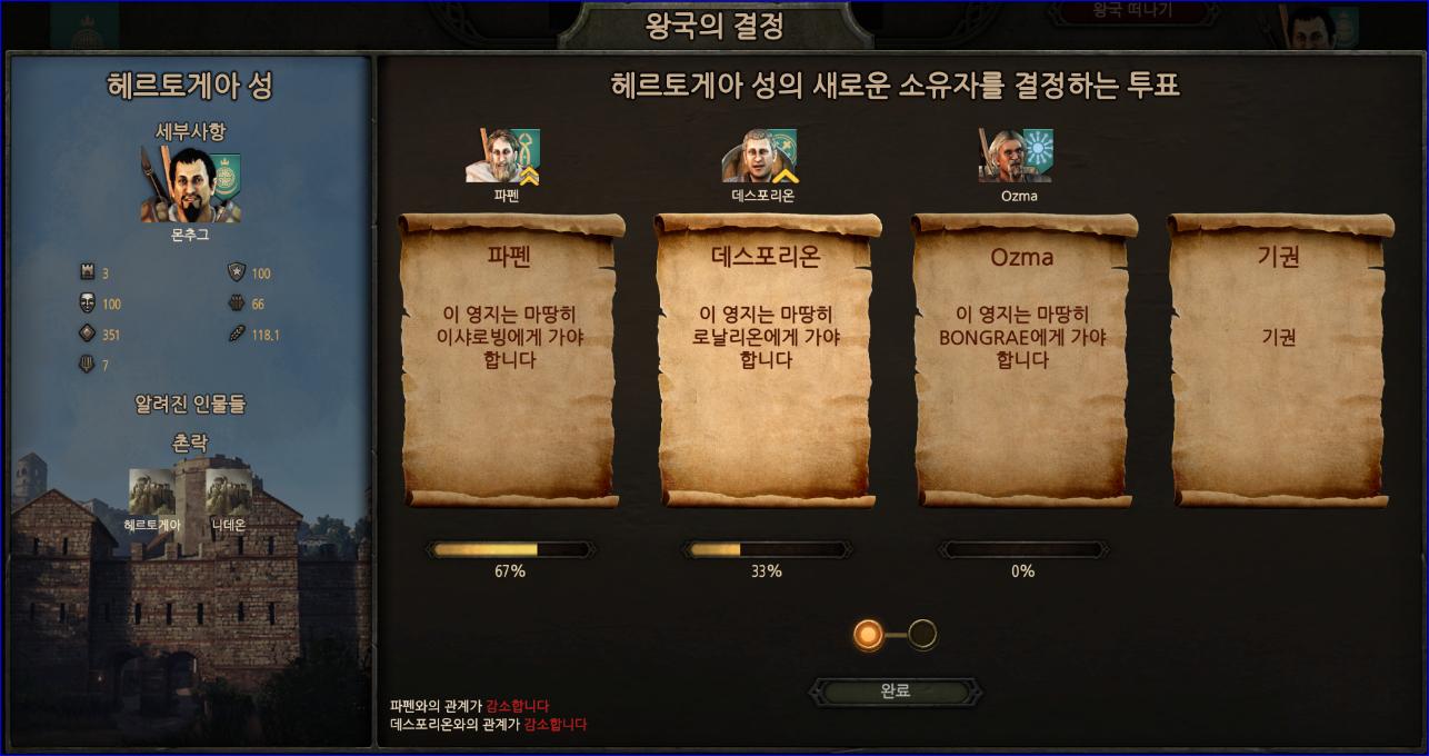 왕국과의 계약이 해지되면 전적 왕국에 내가 사뒀던 공방의 소유권 또한 동시에 없어집니다. 1.5만 디나르 넘게 주고 구입한 공방인데 그냥 포기하면 아깝지요. 따라서 가신의 계약 해지 전, 공방을 되팔아 투자금을 일부라도 회수해야 합니다. 대략 80% 정도의 디나르를 회수할 수 있습니다.