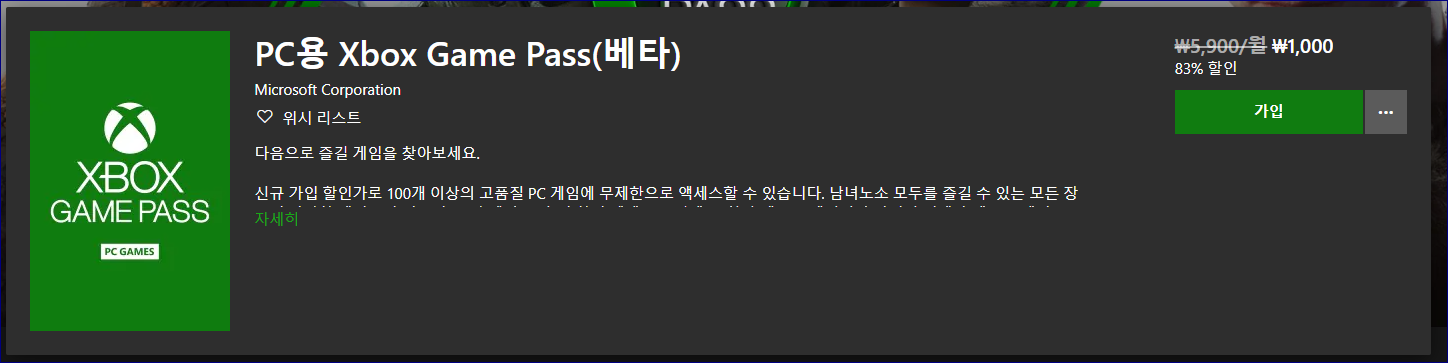 판매 가격은 2만 6천원이지만, 우리는 엑스박스 게임 패스를 통해 한 달 동안 1,000원이라는 매우 싼 가격에