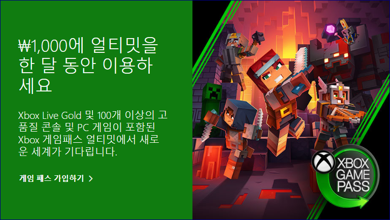 게임 패스 구독 가입을 완료하면 한 달 동안 1,000원의 기간 한정 가격으로 엑스박스 게임 패스에서 제공하고 있는 여러 게임들을 무제한 즐기실 수 있습니다.