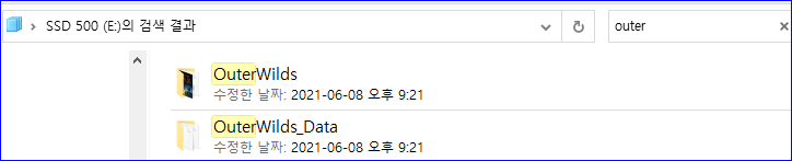 2. 탐색기의 검색 기능을 이용해 Outer Wilds가 설치된 폴더 찾기